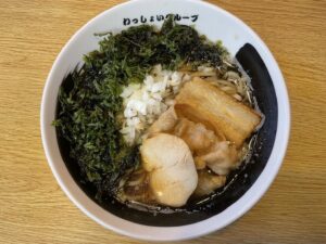 「わっしょい家系ラーメン」 横浜のご当地ラーメン『家系』と言われる豚骨醤油のラーメンをわっしょい風にインスパイアしました。 トッピングはチャーシュー、煮玉子、ほうれん草、海苔です。 麺は家系らしく中細の平打ち麺を使用しています。 ニンニクは… もっと読む »