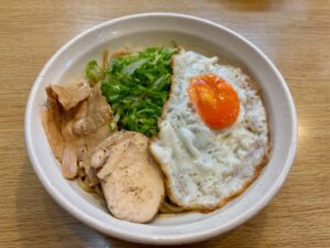 「スパイスバタ-まぜ麺」 独自ブレンドのスパイスとタレに爽やかな酸味!!!濃厚なバターの風味が織りなすちょっとピリ辛なまぜ麺です。 トッピングにはスパイス風味のチャーチ-(鶏のチャーシュー)、目玉焼き、レタス、玉ねぎです。 ニンニクはタレに… もっと読む »