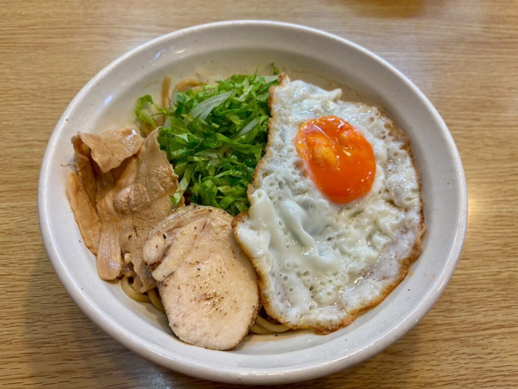 トッピングにはスパイス風味のチャーチ-(鶏のチャーシュー)、目玉焼き、レタス、玉ねぎです。