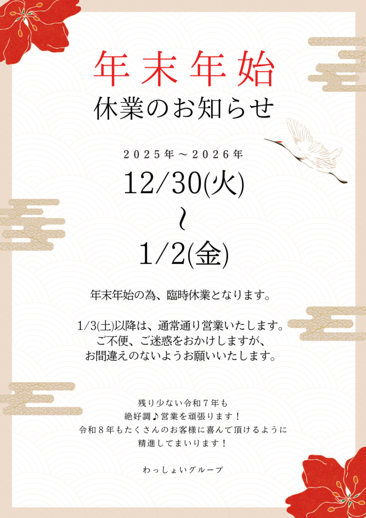 正月休み:12月31日(水)〜1月4日(日)