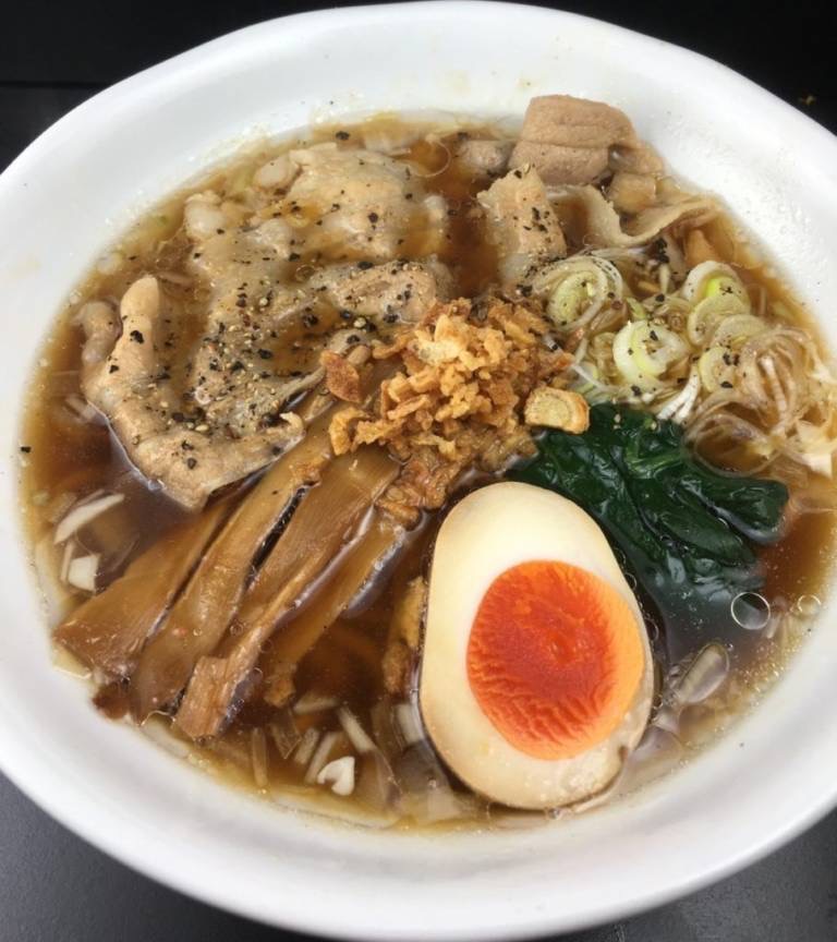 トッピングに豚バラスライス、フライドオニオン、白ネギ、玉ねぎ、ほうれん草、メンマ、煮玉子半玉