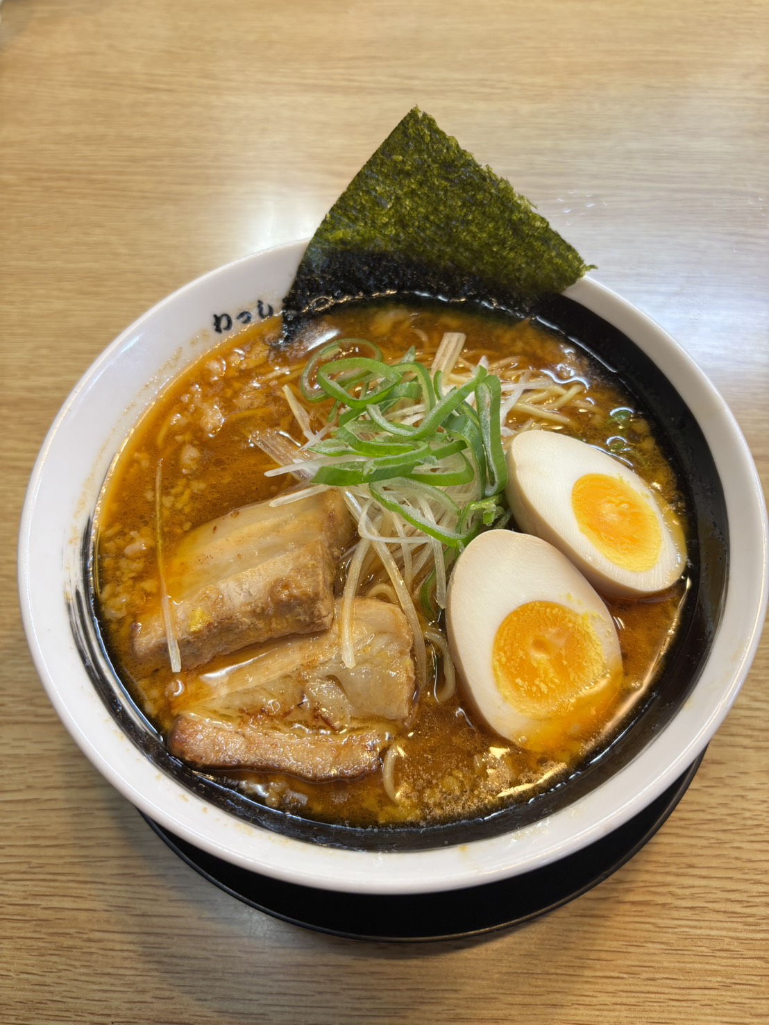 トッピングは、チャーシュー、煮卵、のり、白ネギ。